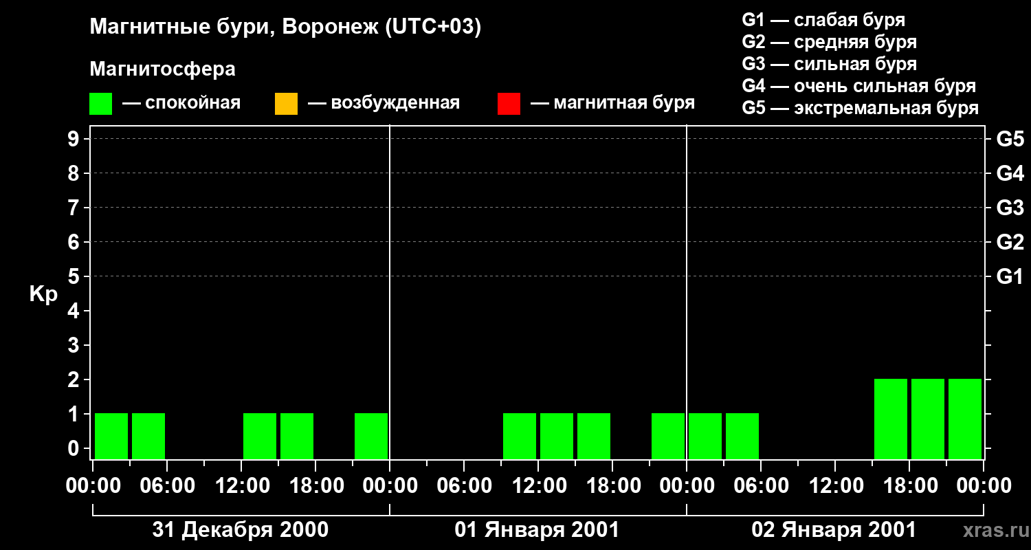 Изменения геомагнитного индекса Kp с 31 декабря 2000 года по 2 января 2001 года для средних широт