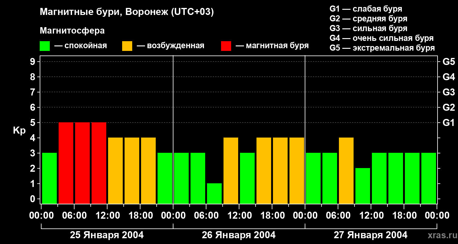 Изменения геомагнитного индекса Kp с 25 по 27 января 2004 года для средних широт