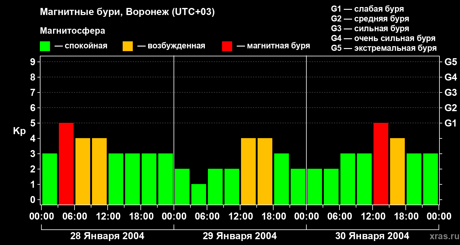 Изменения геомагнитного индекса Kp с 28 по 30 января 2004 года для средних широт