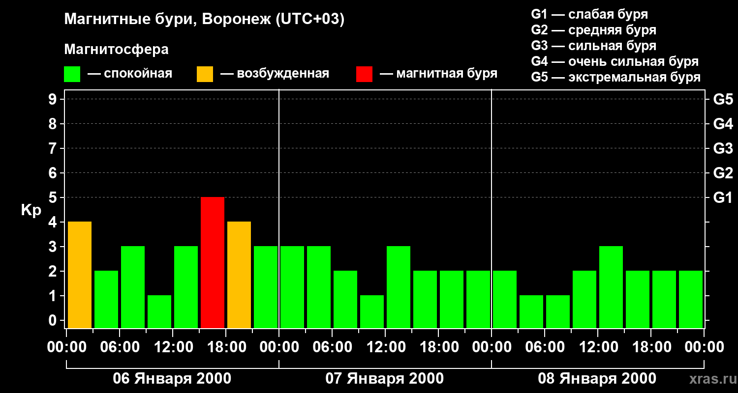 Изменения геомагнитного индекса Kp с 6 по 8 января 2000 года для средних широт