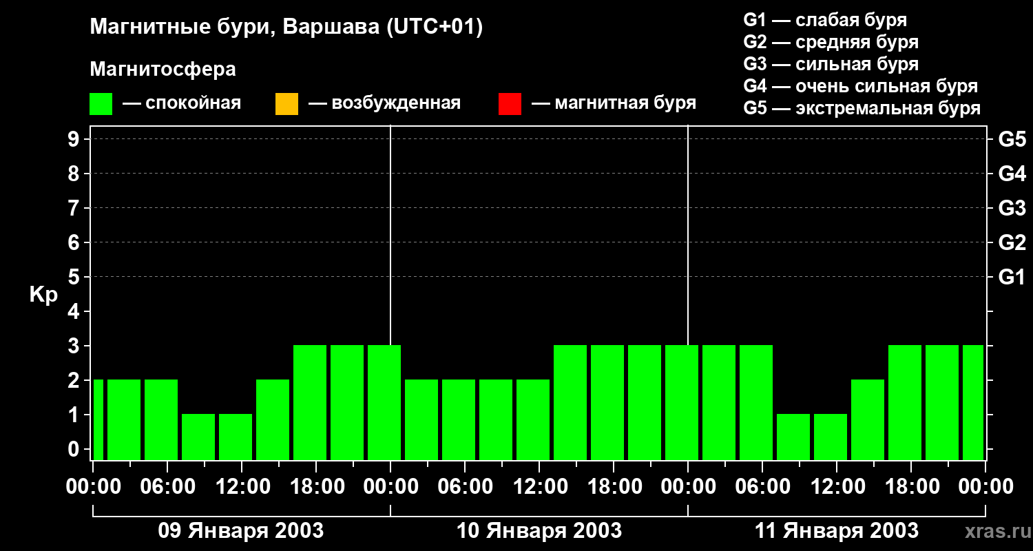 Изменения геомагнитного индекса Kp с 9 по 11 января 2003 года для средних широт
