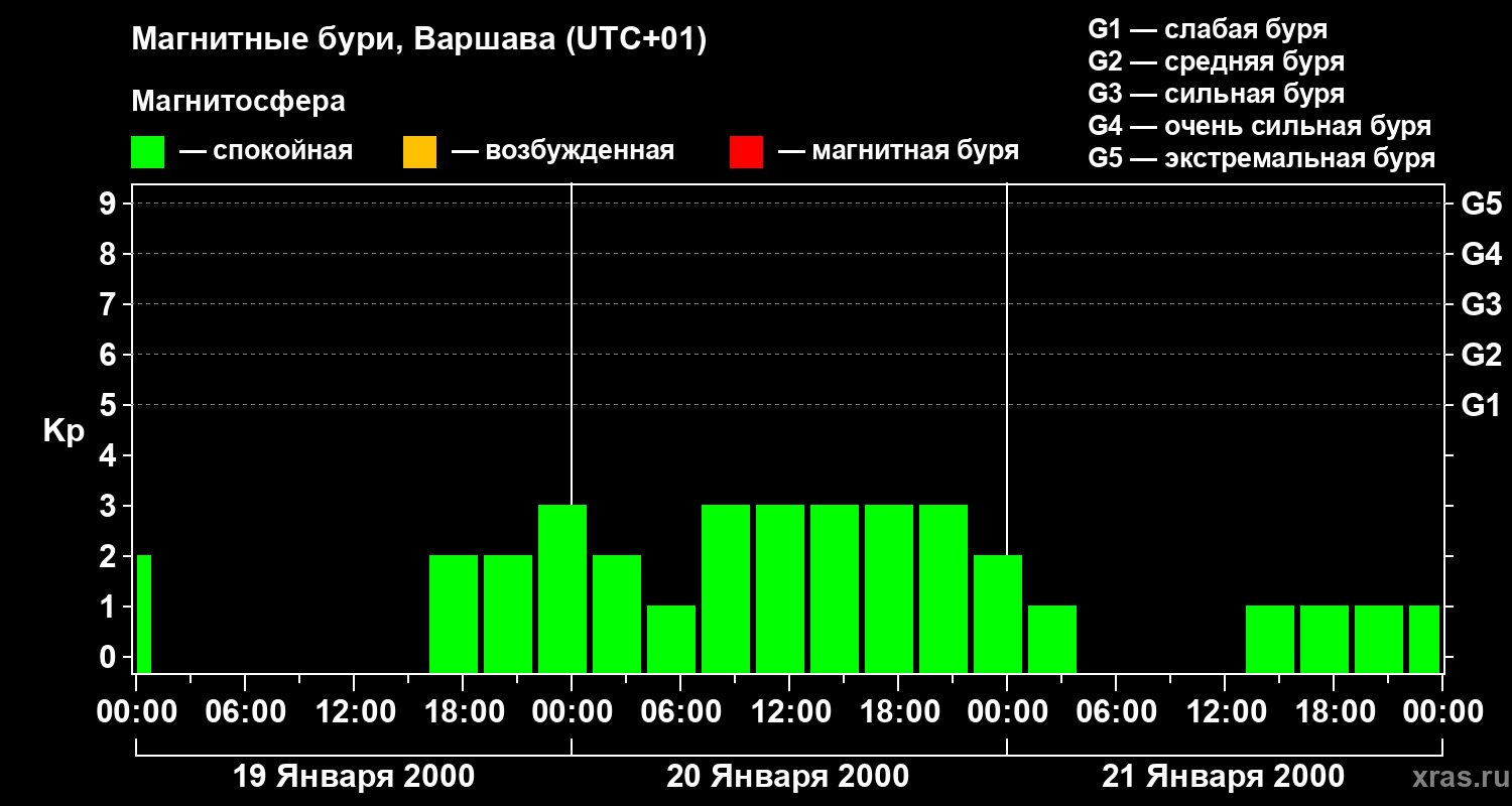 Изменения геомагнитного индекса Kp с 19 по 21 января 2000 года для средних широт
