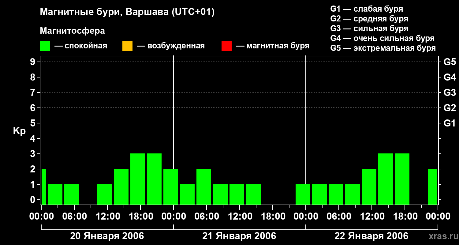 Изменения геомагнитного индекса Kp с 20 по 22 января 2006 года для средних широт