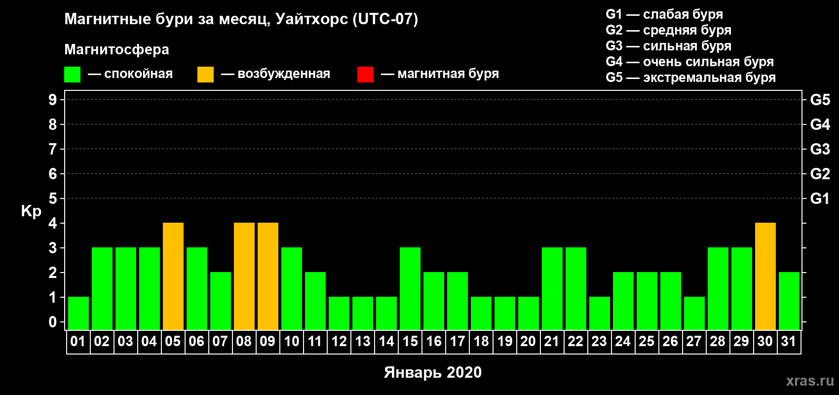 Магнитные бури в Уайтхорсе 1 января 2020 года