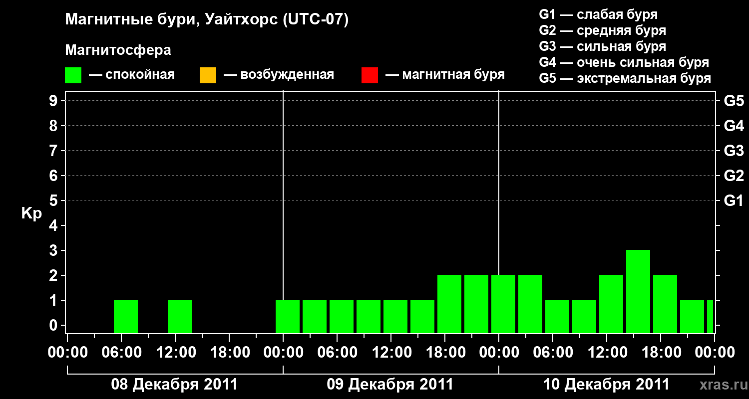 Изменения геомагнитного индекса Kp с 8 по 10 декабря 2011 года для средних широт