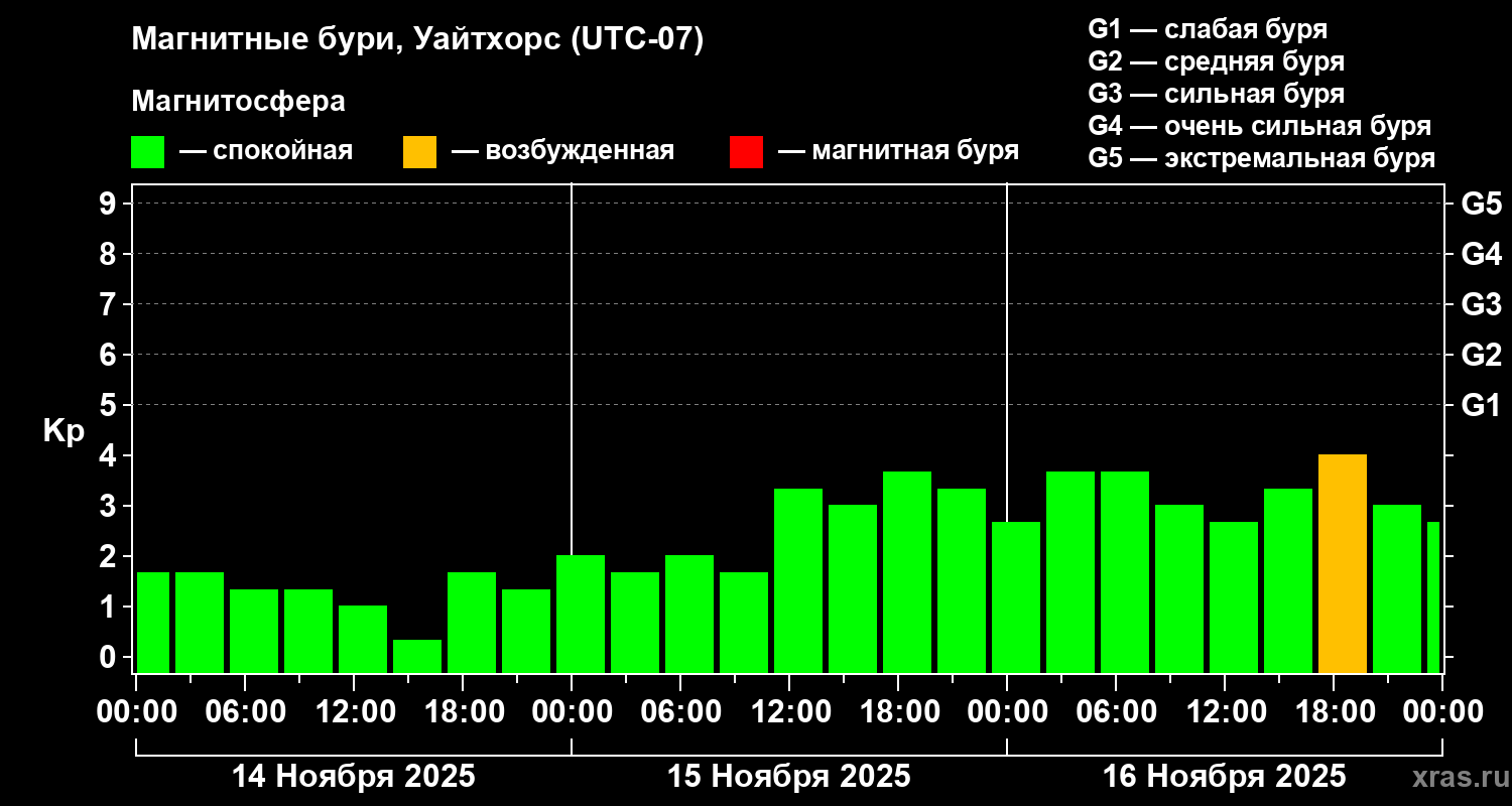 Магнитные бури в Уайтхорсе 16 ноября 2025 года