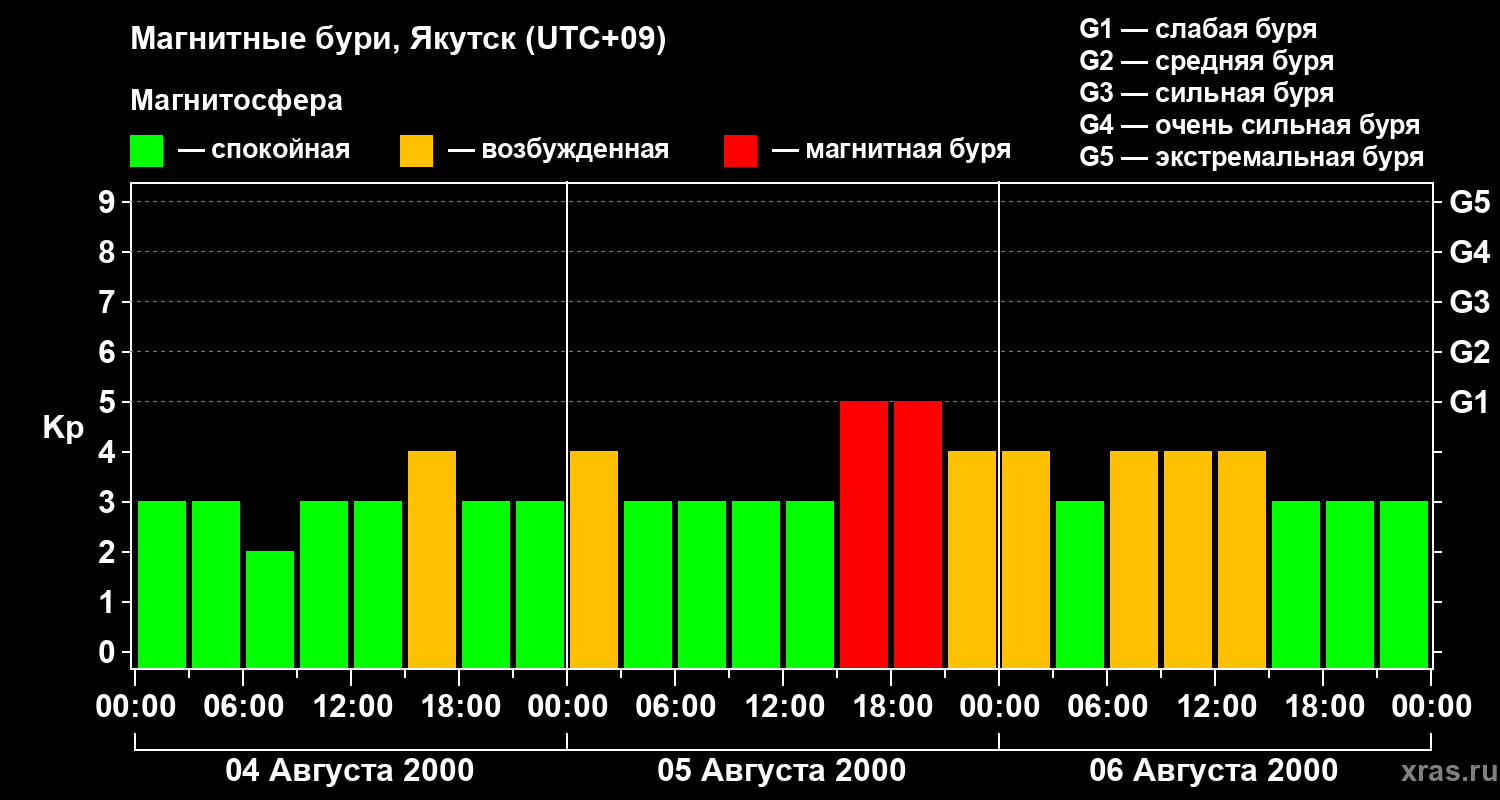 Изменения геомагнитного индекса Kp с 4 по 6 августа 2000 года для средних широт