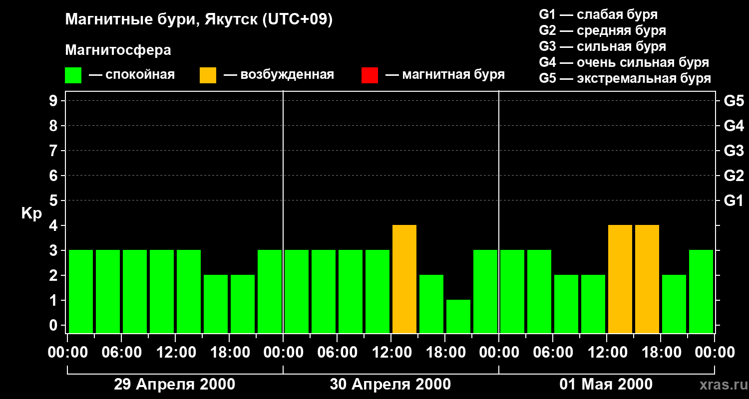 Изменения геомагнитного индекса Kp с 29 апреля по 1 мая 2000 года для средних широт