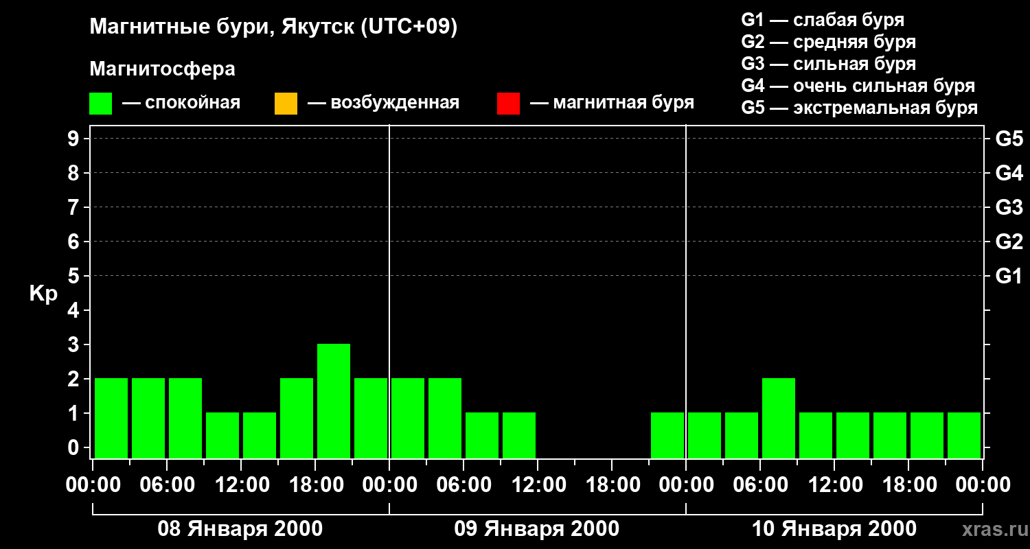Изменения геомагнитного индекса Kp с 8 по 10 января 2000 года для средних широт