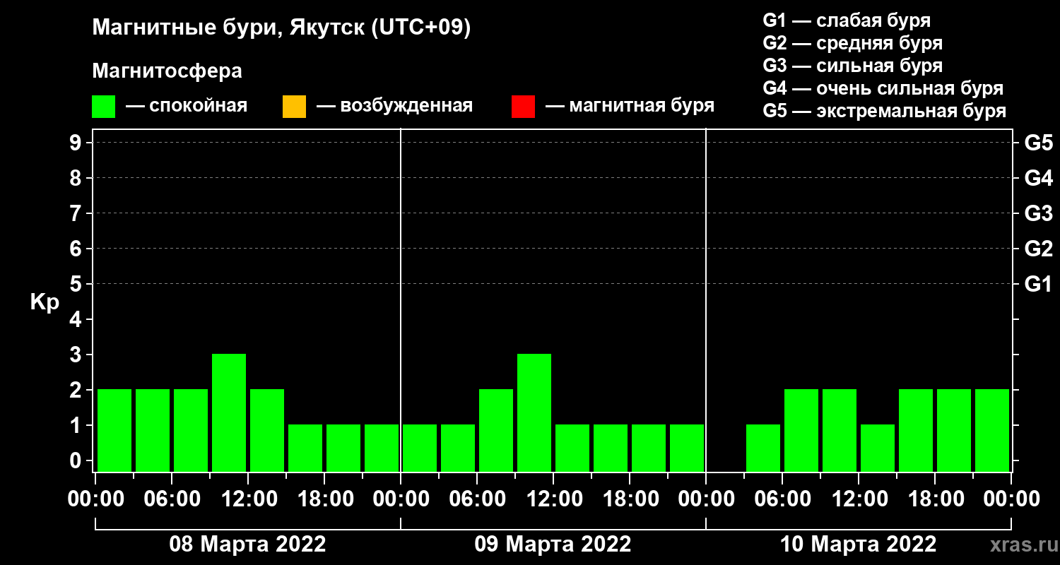Изменения геомагнитного индекса Kp с 8 по 10 марта 2022 года для средних широт