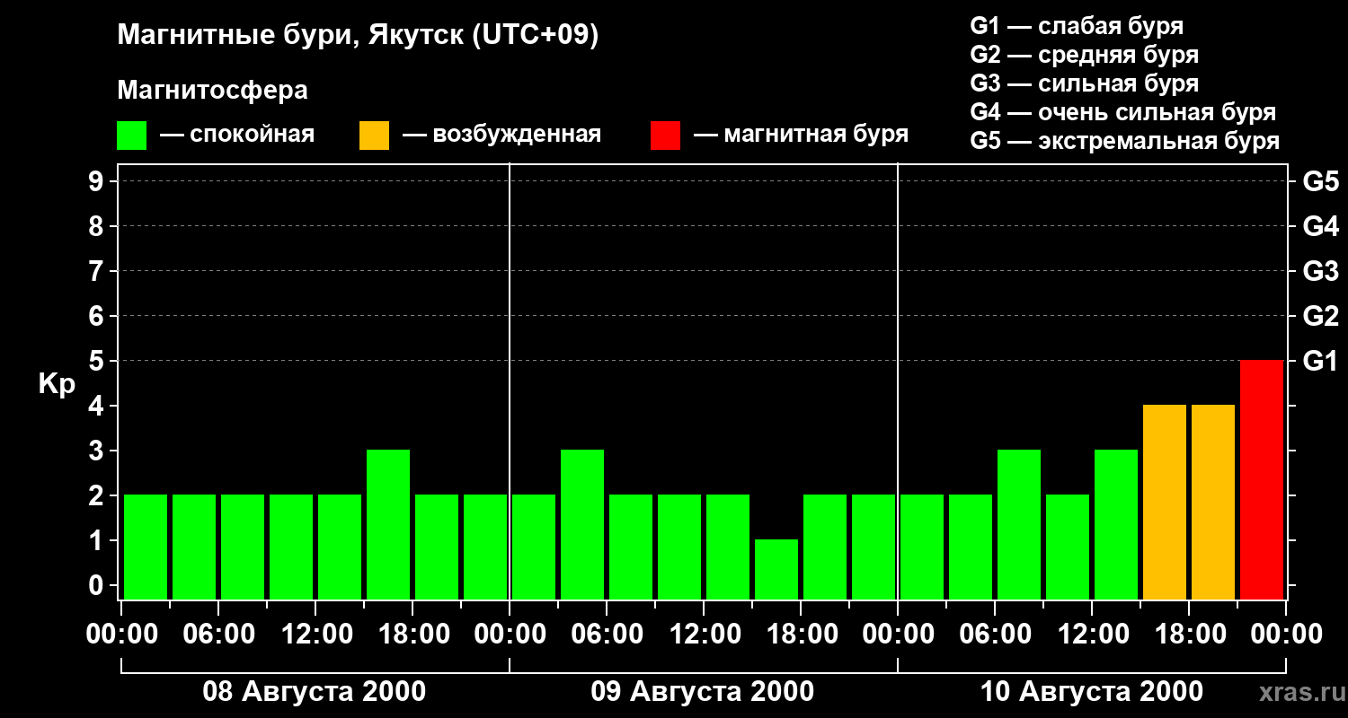 Изменения геомагнитного индекса Kp с 8 по 10 августа 2000 года для средних широт