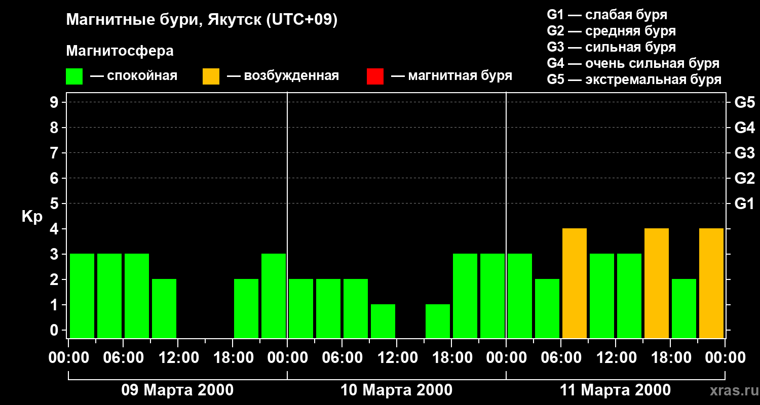 Изменения геомагнитного индекса Kp с 9 по 11 марта 2000 года для средних широт