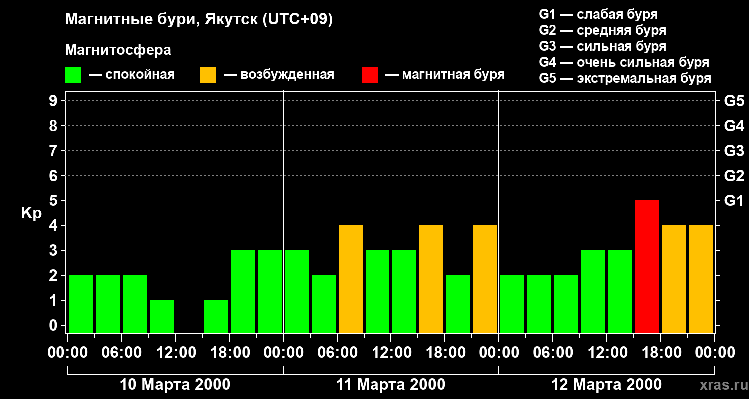 Изменения геомагнитного индекса Kp с 10 по 12 марта 2000 года для средних широт