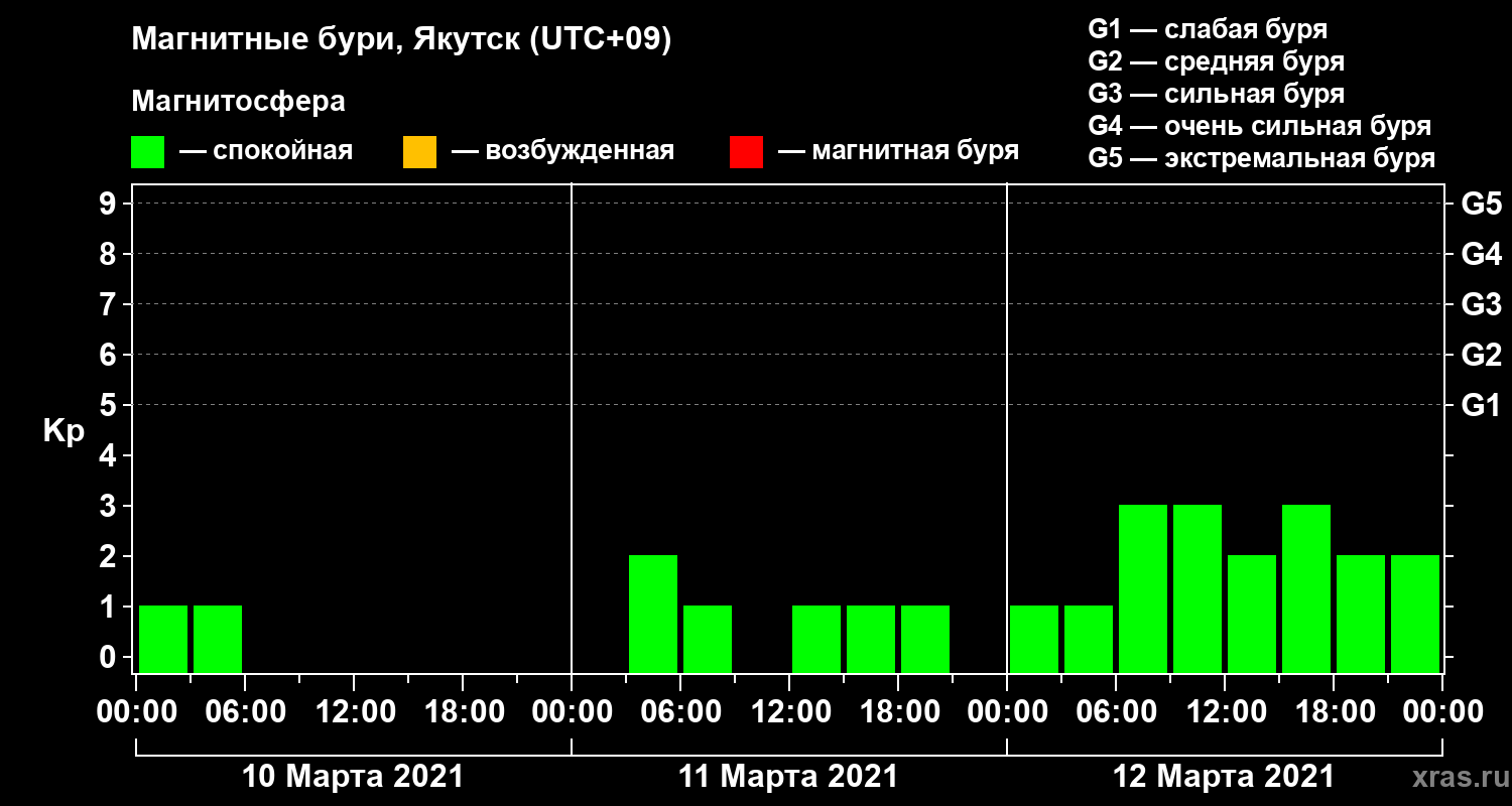 Изменения геомагнитного индекса Kp с 10 по 12 марта 2021 года для средних широт
