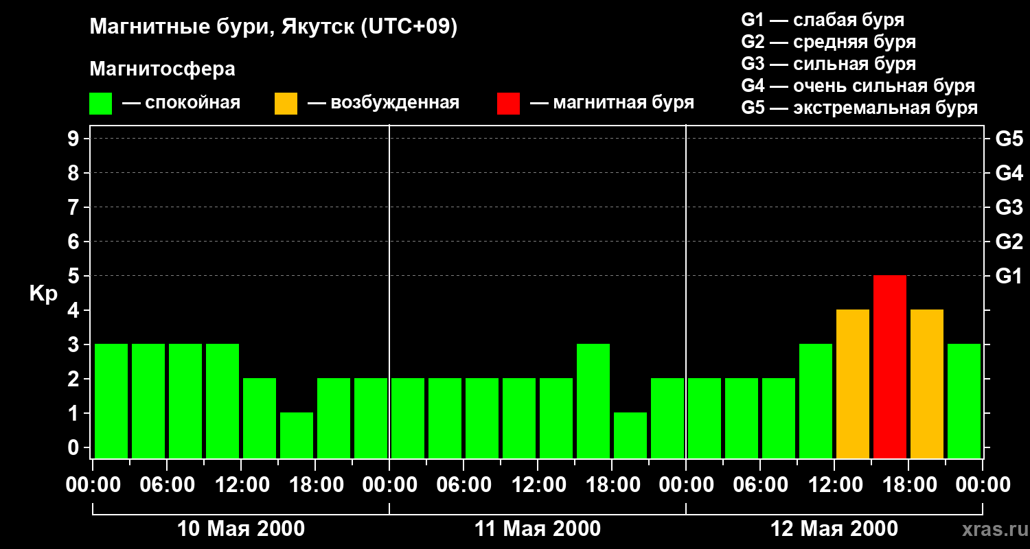 Изменения геомагнитного индекса Kp с 10 по 12 мая 2000 года для средних широт