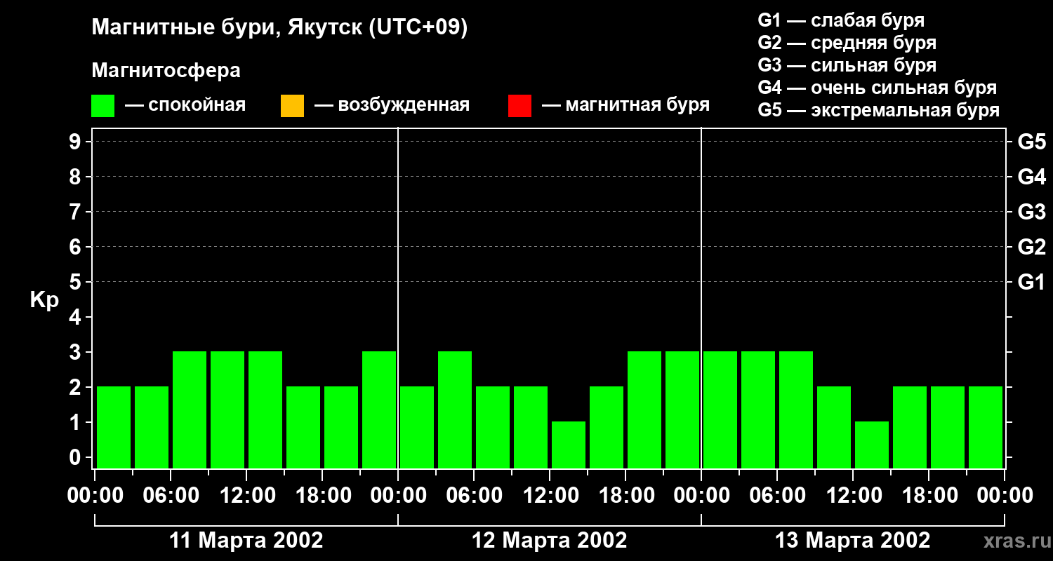 Изменения геомагнитного индекса Kp с 11 по 13 марта 2002 года для средних широт