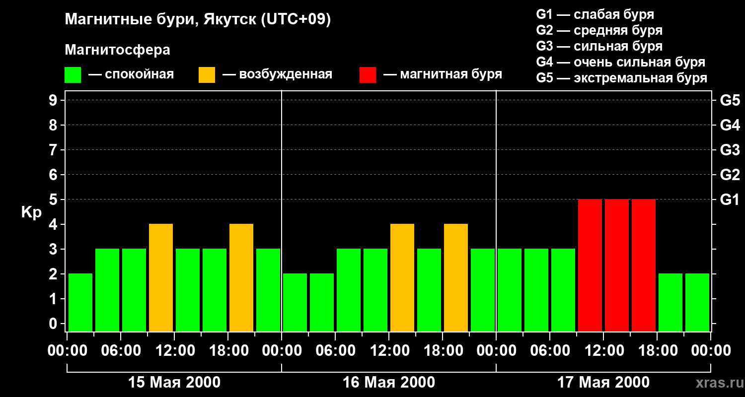 Изменения геомагнитного индекса Kp с 15 по 17 мая 2000 года для средних широт