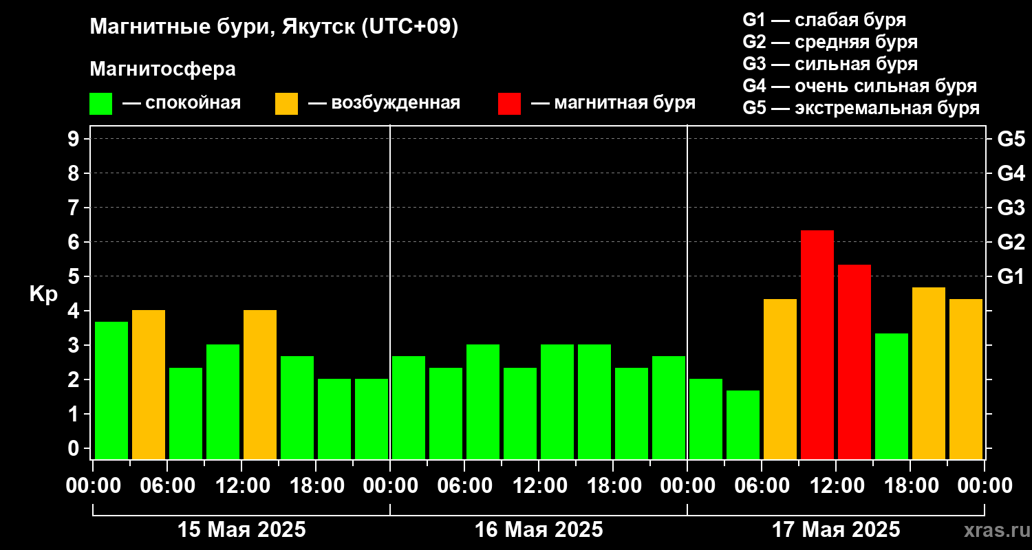 Изменения геомагнитного индекса Kp с 15 по 17 мая 2025 года для средних широт