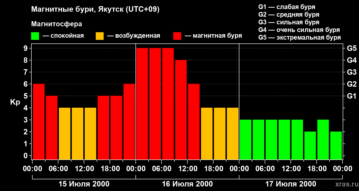 Изменения геомагнитного индекса Kp с 15 по 17 июля 2000 года для средних широт