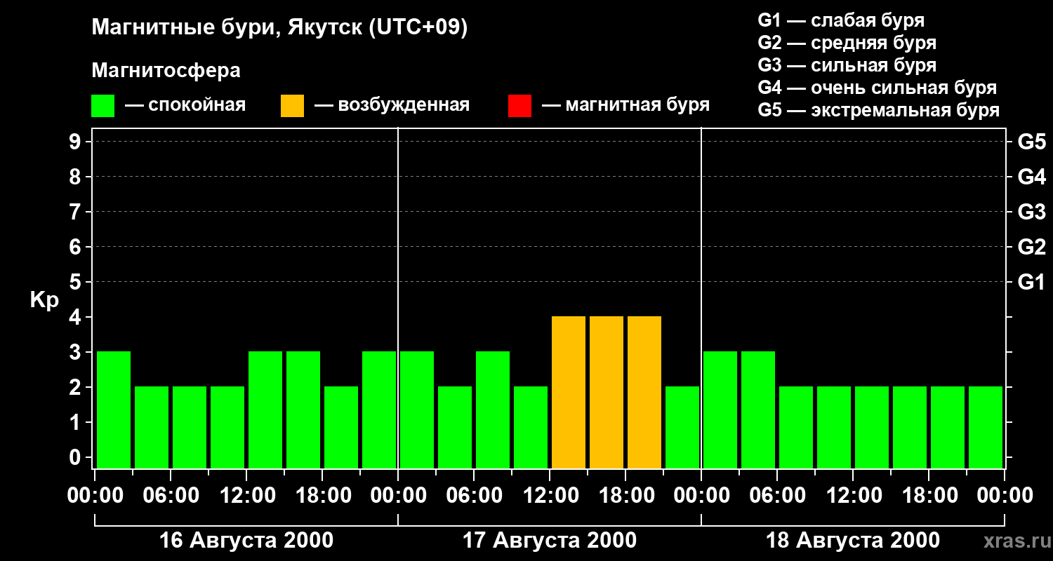 Изменения геомагнитного индекса Kp с 16 по 18 августа 2000 года для средних широт