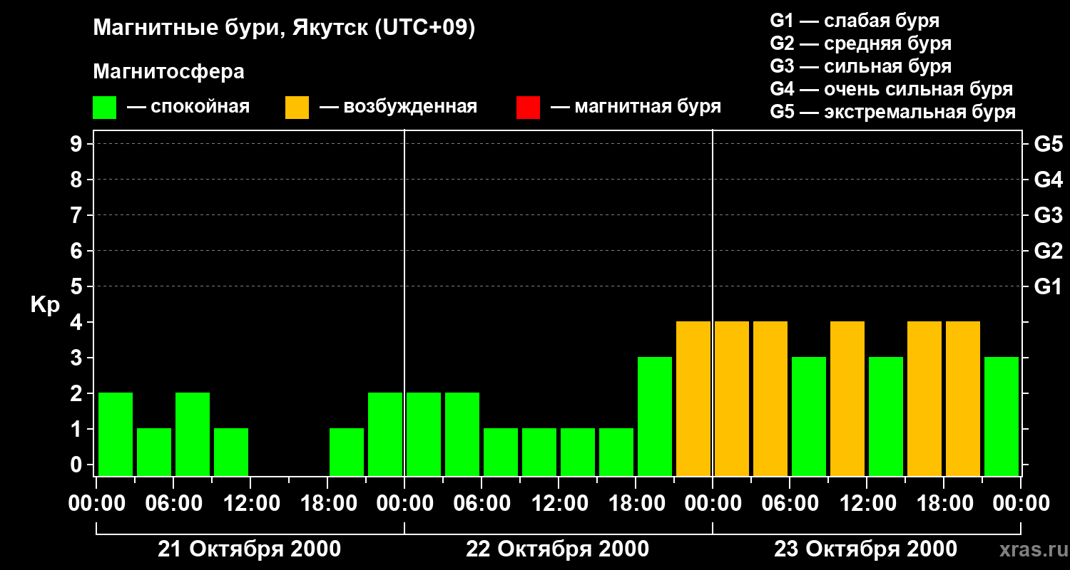 Изменения геомагнитного индекса Kp с 21 по 23 октября 2000 года для средних широт