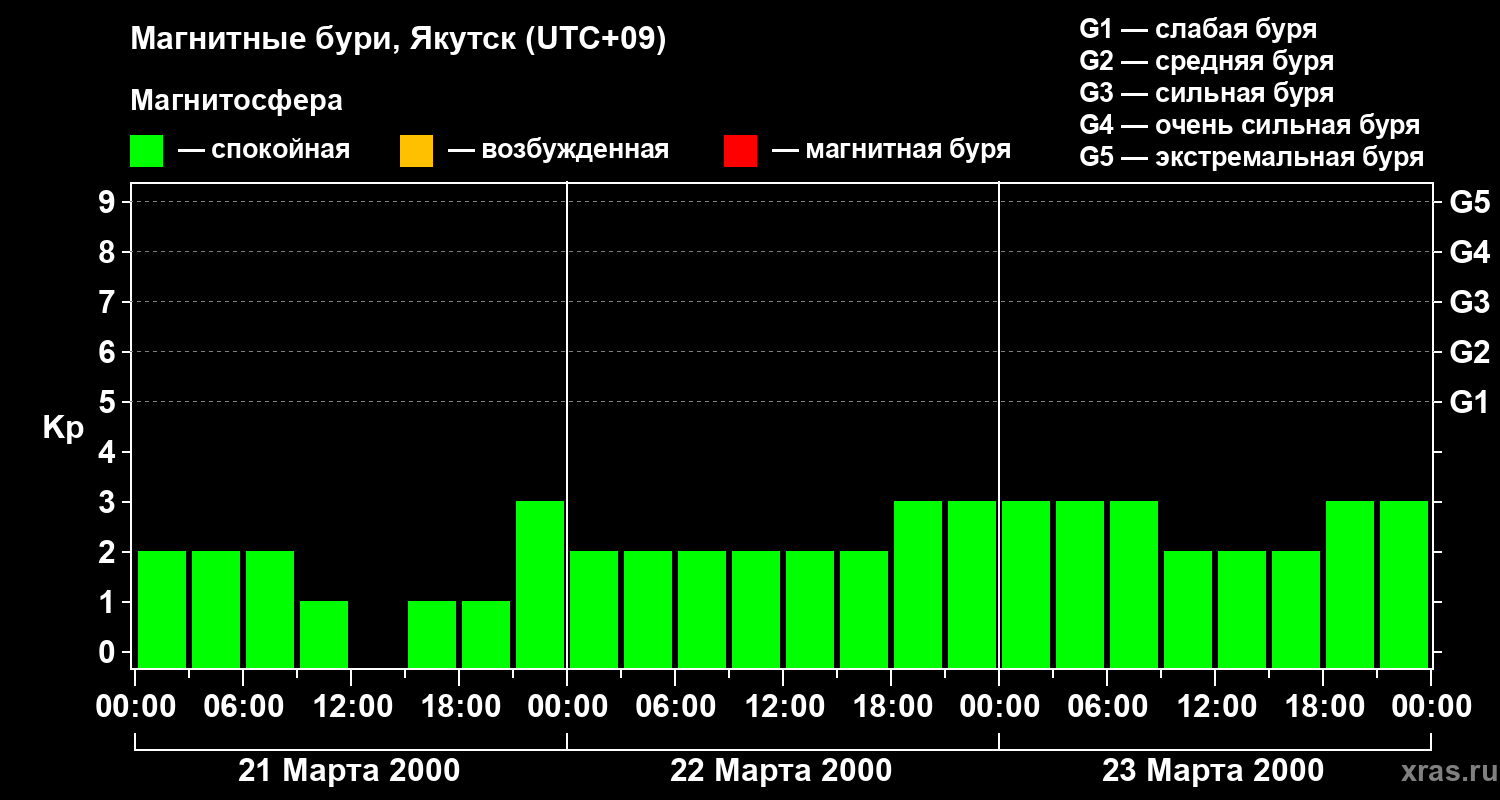 Изменения геомагнитного индекса Kp с 21 по 23 марта 2000 года для средних широт