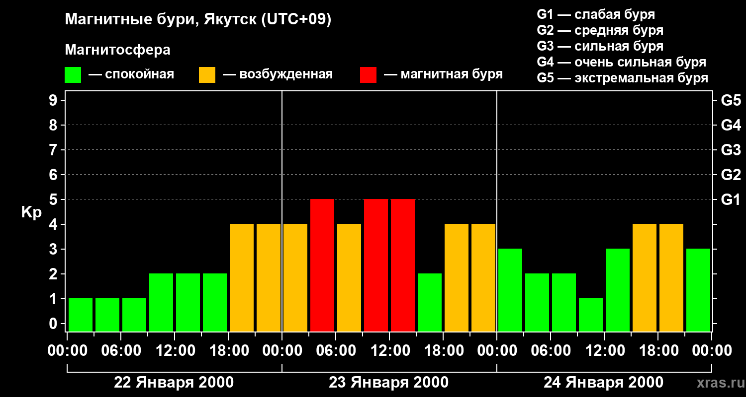 Изменения геомагнитного индекса Kp с 22 по 24 января 2000 года для средних широт