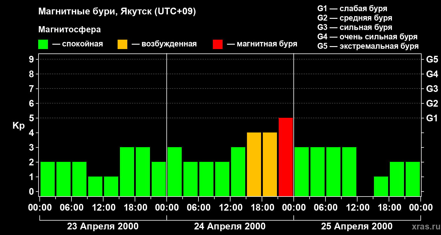 Изменения геомагнитного индекса Kp с 23 по 25 апреля 2000 года для средних широт