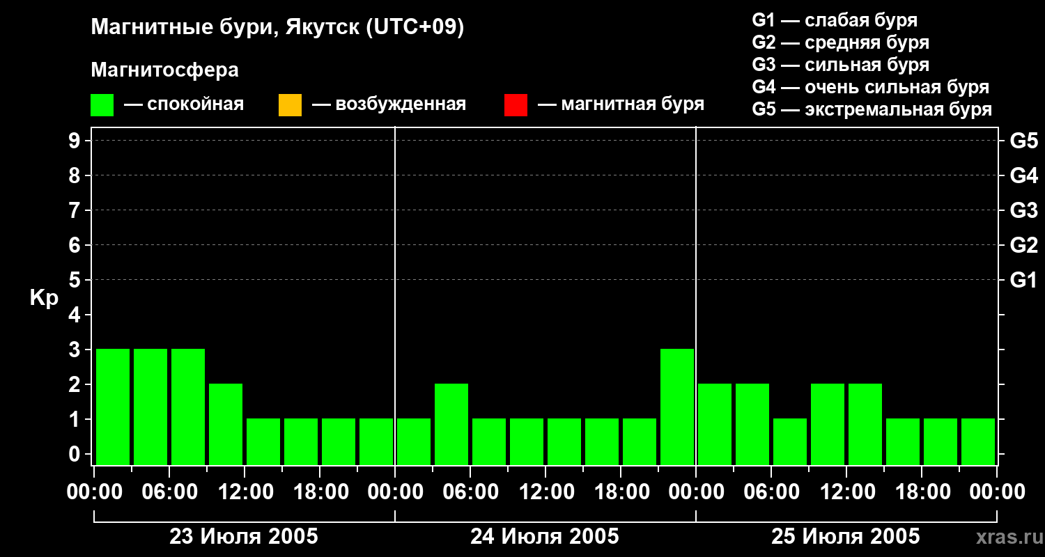 Изменения геомагнитного индекса Kp с 23 по 25 июля 2005 года для средних широт