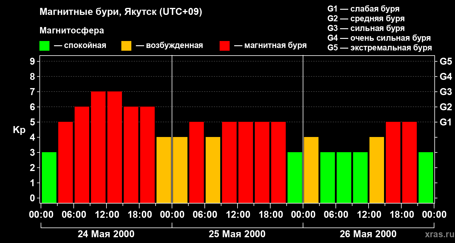Изменения геомагнитного индекса Kp с 24 по 26 мая 2000 года для средних широт