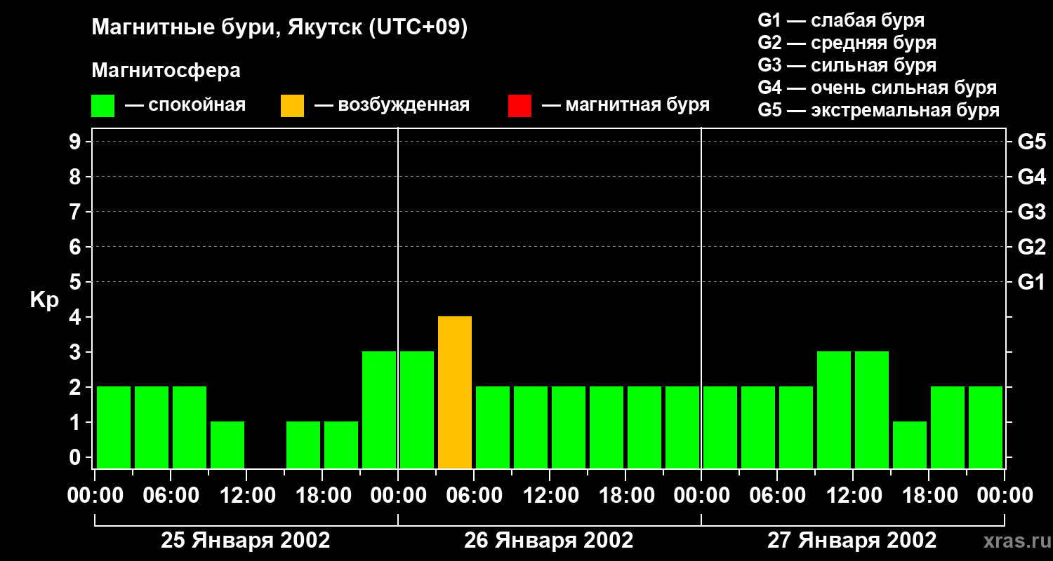 Изменения геомагнитного индекса Kp с 25 по 27 января 2002 года для средних широт