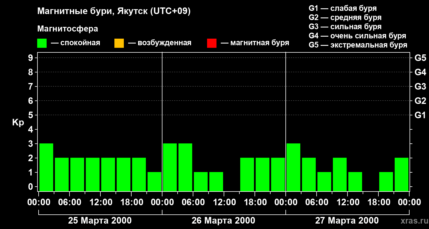 Изменения геомагнитного индекса Kp с 25 по 27 марта 2000 года для средних широт