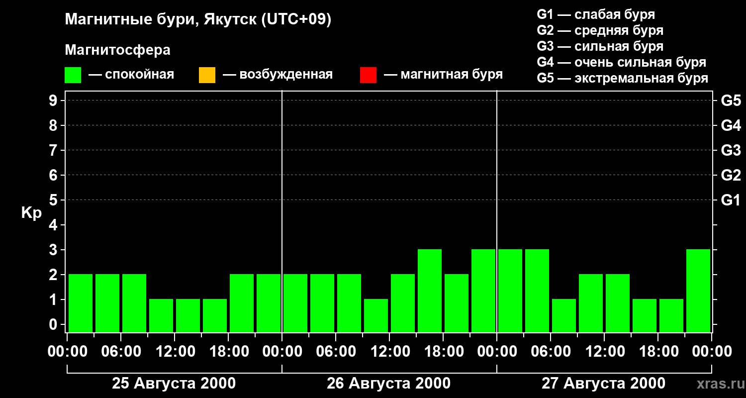 Изменения геомагнитного индекса Kp с 25 по 27 августа 2000 года для средних широт