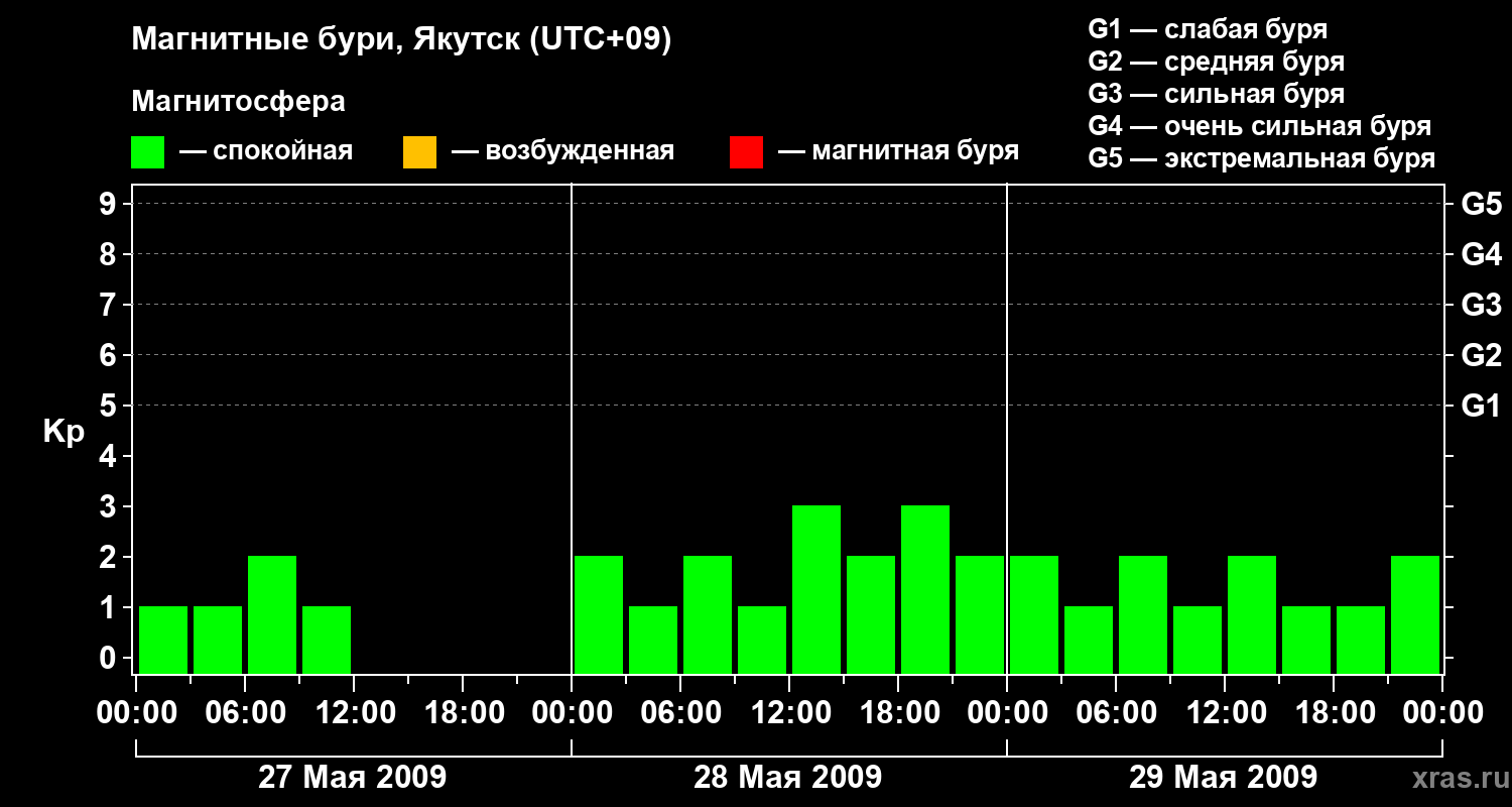 Изменения геомагнитного индекса Kp с 27 по 29 мая 2009 года для средних широт