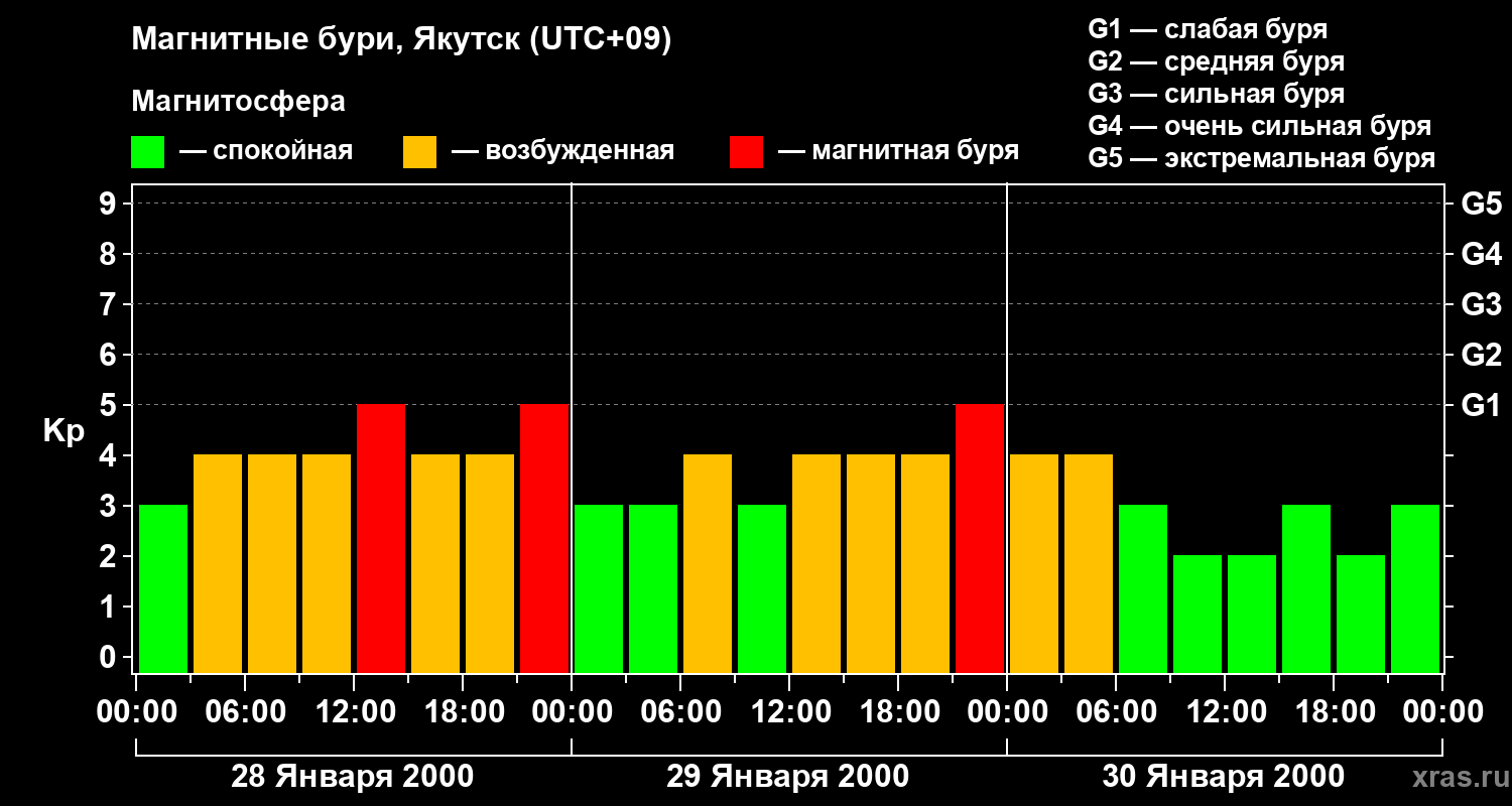 Изменения геомагнитного индекса Kp с 28 по 30 января 2000 года для средних широт