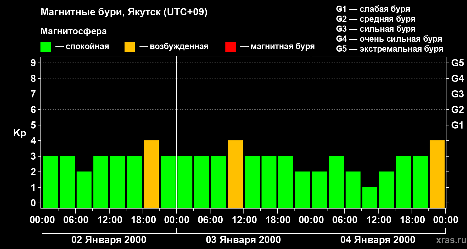 Изменения геомагнитного индекса Kp с 2 по 4 января 2000 года для средних широт