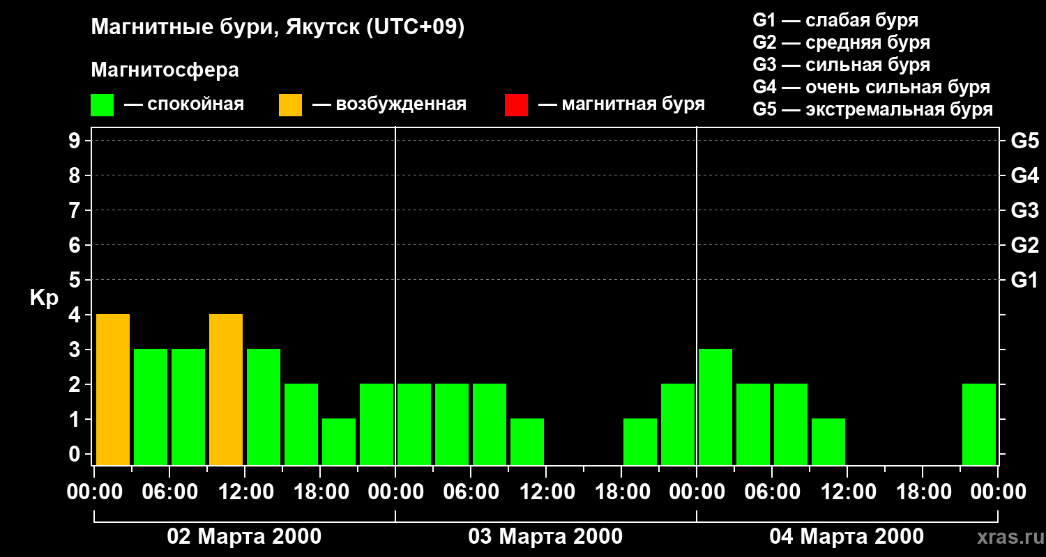 Изменения геомагнитного индекса Kp с 2 по 4 марта 2000 года для средних широт