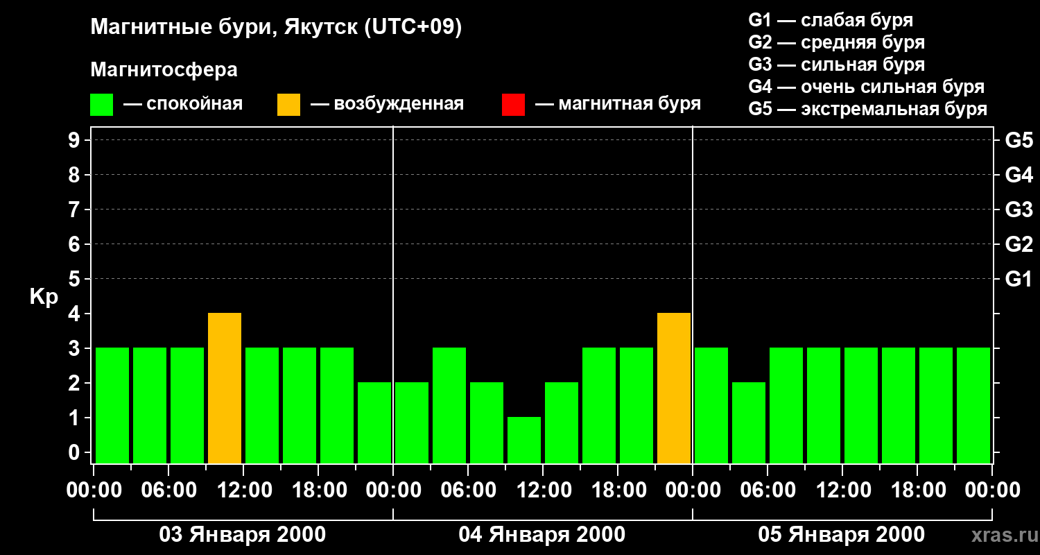 Изменения геомагнитного индекса Kp с 3 по 5 января 2000 года для средних широт
