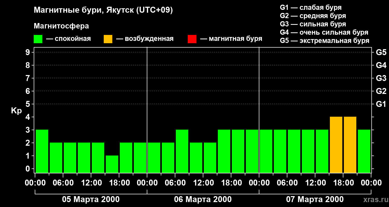 Изменения геомагнитного индекса Kp с 5 по 7 марта 2000 года для средних широт