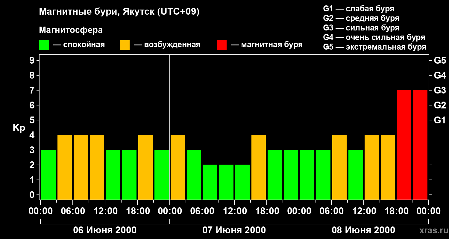 Изменения геомагнитного индекса Kp с 6 по 8 июня 2000 года для средних широт