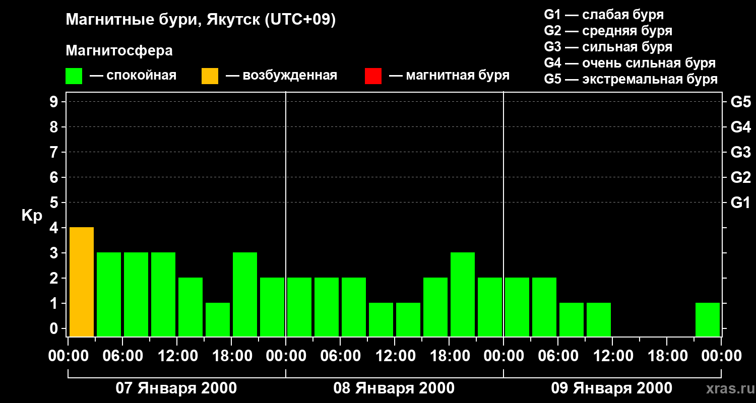 Изменения геомагнитного индекса Kp с 7 по 9 января 2000 года для средних широт