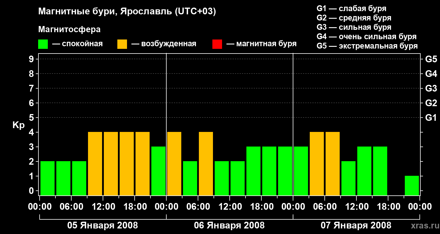 Изменения геомагнитного индекса Kp с 5 по 7 января 2008 года для средних широт