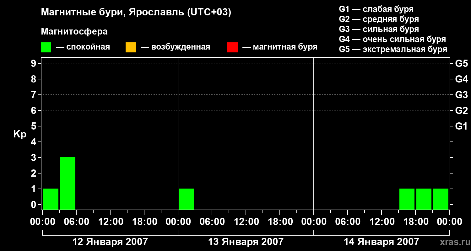 Изменения геомагнитного индекса Kp с 12 по 14 января 2007 года для средних широт