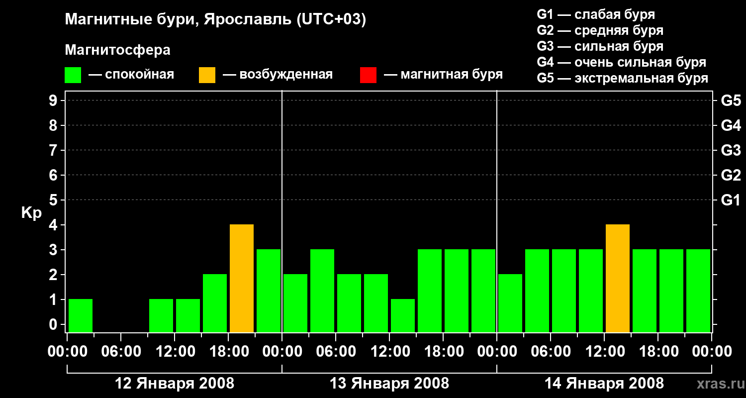 Изменения геомагнитного индекса Kp с 12 по 14 января 2008 года для средних широт