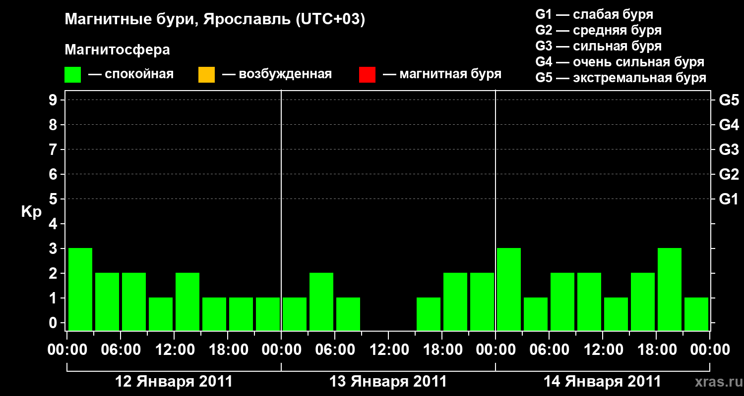 Изменения геомагнитного индекса Kp с 12 по 14 января 2011 года для средних широт