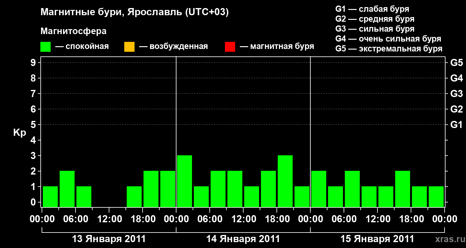 Изменения геомагнитного индекса Kp с 13 по 15 января 2011 года для средних широт
