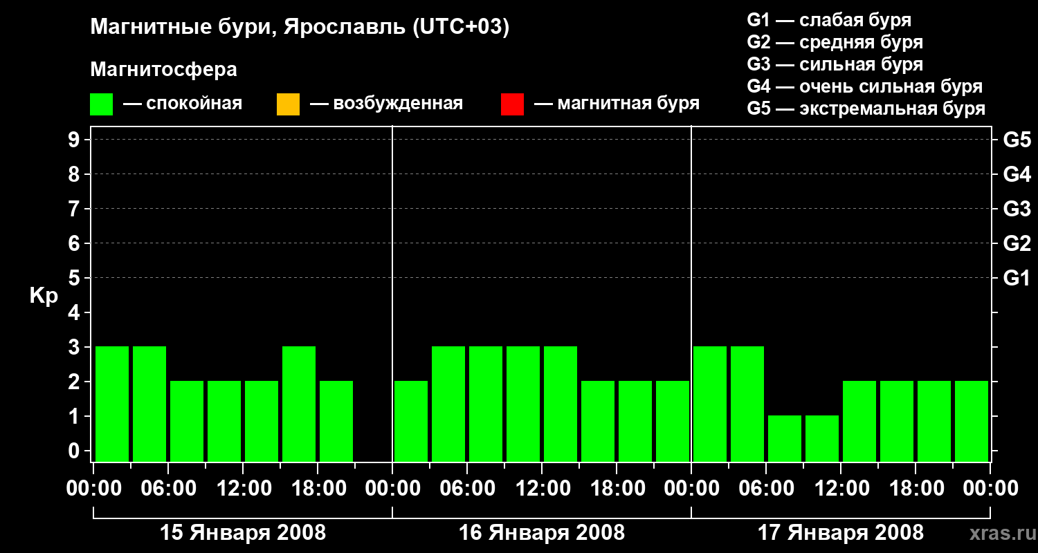 Изменения геомагнитного индекса Kp с 15 по 17 января 2008 года для средних широт