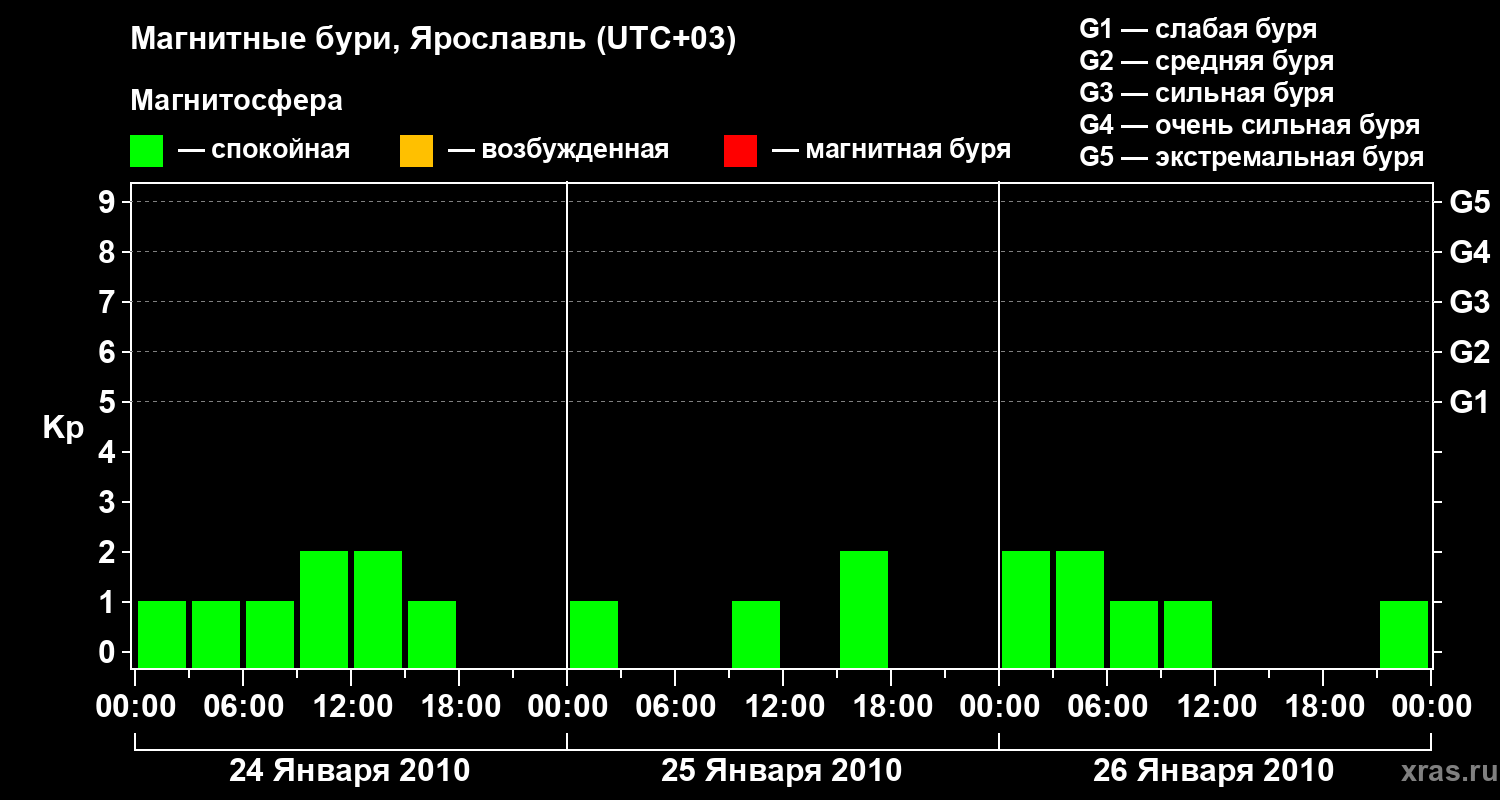 Изменения геомагнитного индекса Kp с 24 по 26 января 2010 года для средних широт