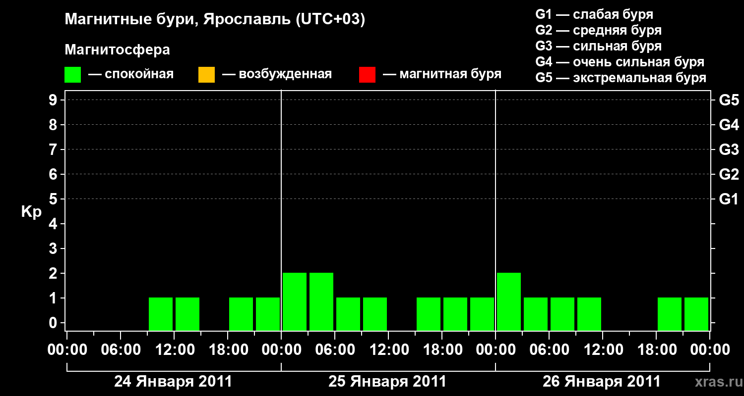 Изменения геомагнитного индекса Kp с 24 по 26 января 2011 года для средних широт