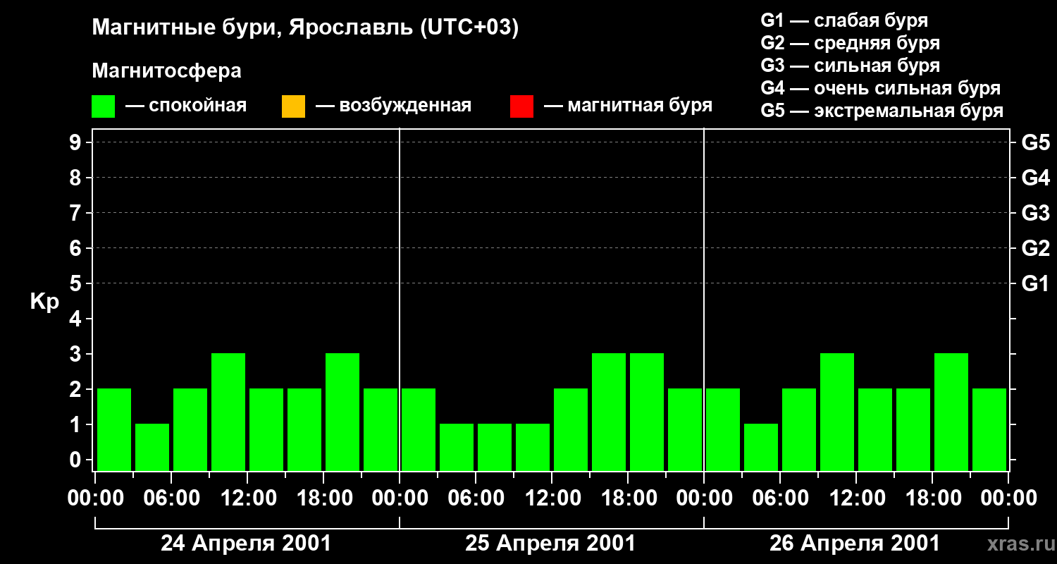 Изменения геомагнитного индекса Kp с 24 по 26 апреля 2001 года для средних широт